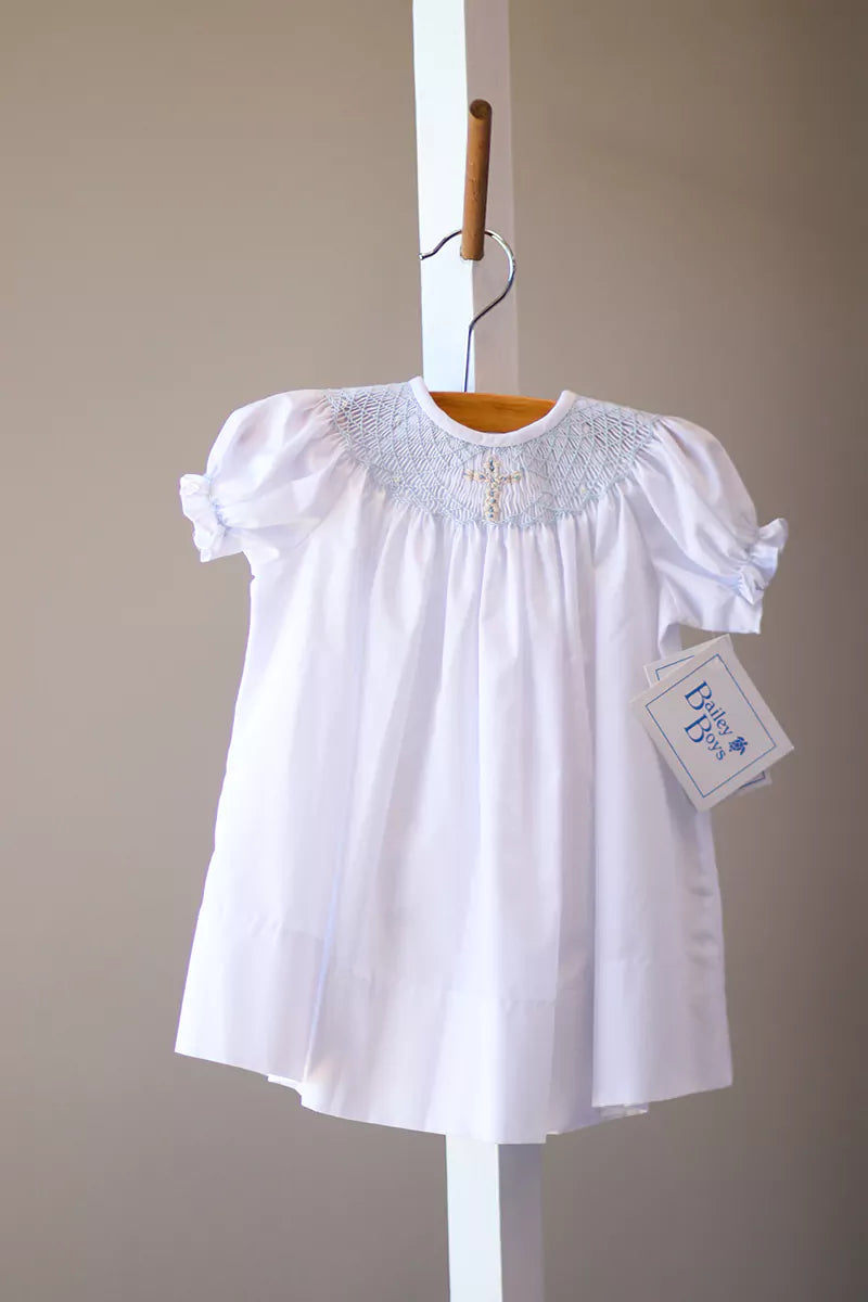 Handcrafted with care, this heirloom-quality dress features delicate blue smocking across the chest, adorned with a tiny beaded cross that shimmers softly in the light. The gentle puff sleeves, classic bishop neckline, and flowing silhouette come together to create a look that’s both traditional and effortlessly elegant. Made from soft, breathable cotton, it ensures your baby stays comfortable throughout the ceremony and celebration.