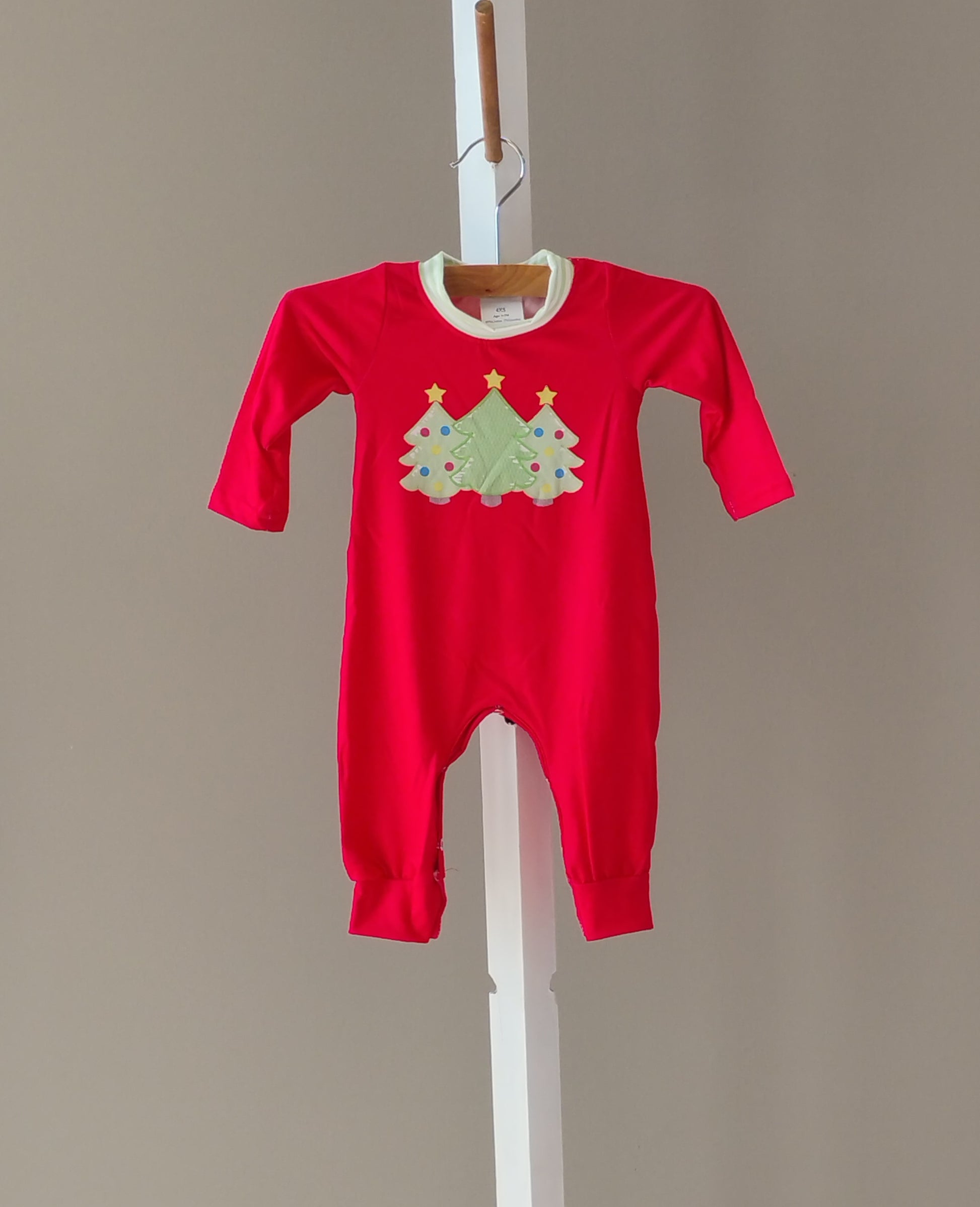 Make your baby the brightest star of the season! This festive red romper is designed with comfort and cuteness in mind. The front features three cheerful Christmas trees with colorful ornaments and sparkling star tops, adding the perfect touch of seasonal charm.