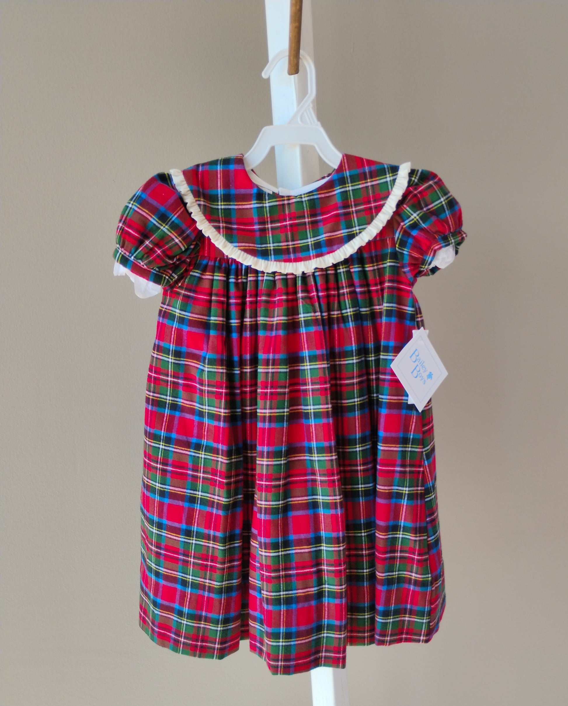 This charming Bailey Boys dress captures holiday spirit with timeless appeal perfect for any celebration. Crafted in soft 100% cotton with a coordinating liner blend of 65% polyester and 35% cotton, the flowy silhouette features a classic plaid pattern in festive red and green. The bishop-style design offers an elegant, vintage-inspired look that transitions beautifully from Christmas gatherings to special occasions throughout the year. Care instructions are conveniently labeled on the tag for easy maintenance. An adorable essential for any young girl's wardrobe.