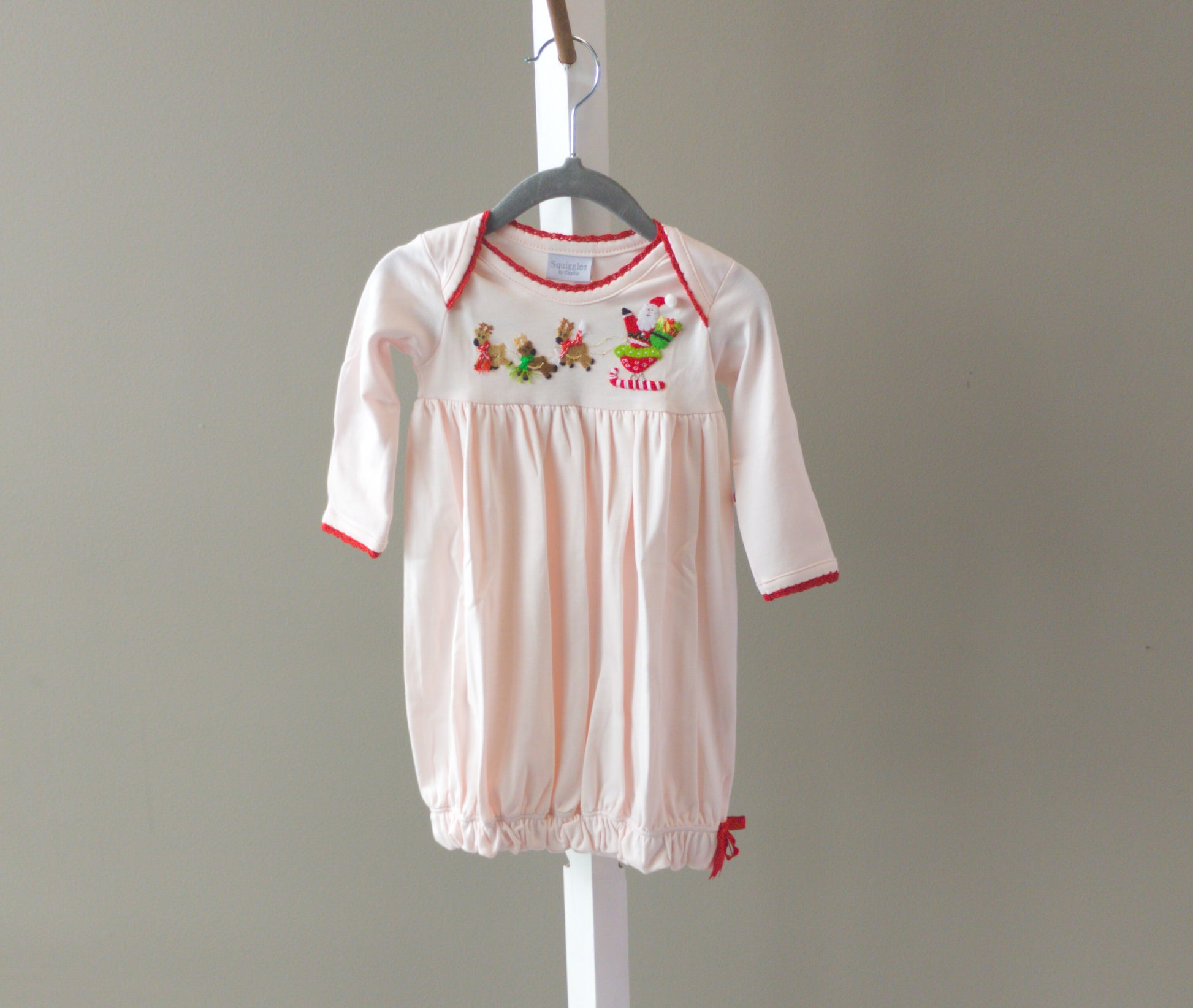 Celebrate the season with this delightful Christmas gown from Flower Child Boutique in Columbia, MS. Featuring charming 3D embroidery details of sleighs and reindeer, this sweet pink design brings festive magic to your little girl's wardrobe. The signature Squiggles brand construction ensures exceptional comfort and durability, with a relaxed gown silhouette perfect for sleeping, playing, and holiday gatherings. Soft, breathable fabric keeps your daughter cozy throughout the day and night. An ideal choice for creating cherished Christmas memories and photos.
